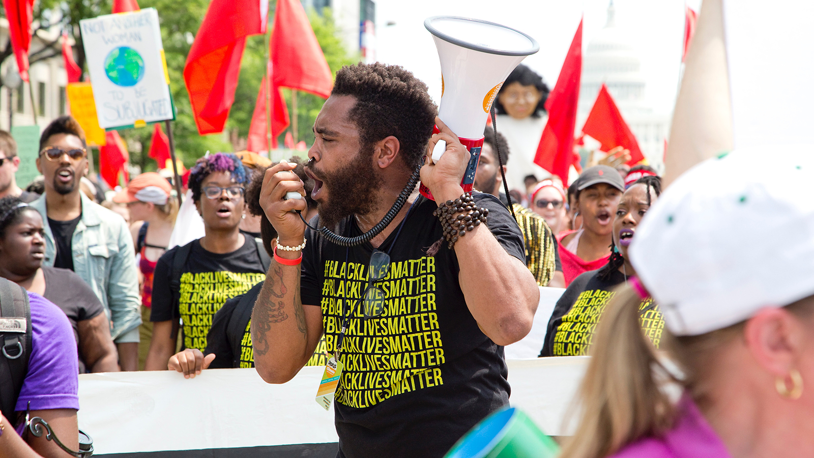 Teddy Washington, a subject of Richard Weiss's project, engages with Washington Post reporter Wesley Lowery.