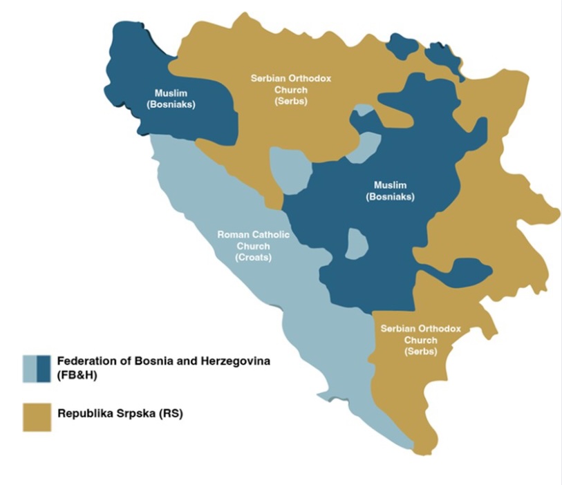 A map of Bosnia and Herzegovina showing its two political entities: the Federation of Bosnia and Herzegovina (in blue) and Republika Srpska (in brown). The map also indicates the primary religious and ethnic groups in each area—Bosniaks (Muslims) in much of the Federation, Croats (Roman Catholics) in the southwest, and Serbs (Serbian Orthodox) in Republika Srpska.